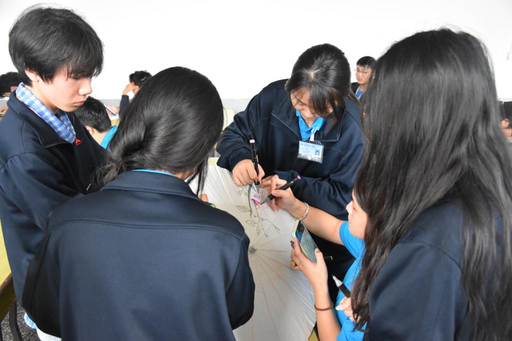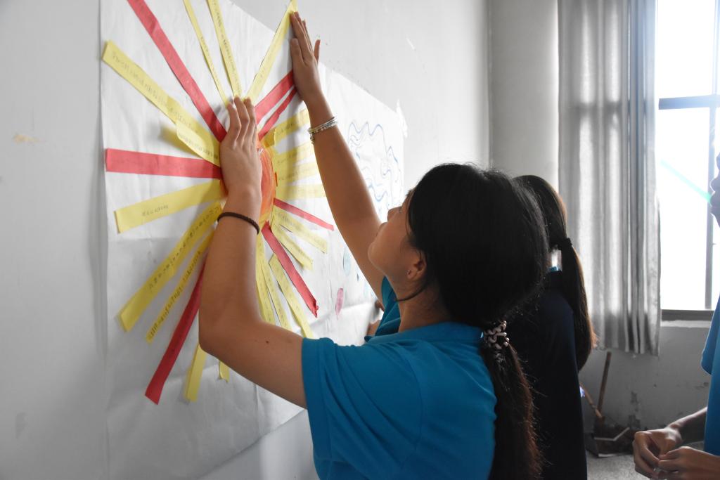 活动伊始,心理部成员提前到达场地,布置好桌椅、横幅、画纸、彩色绘画等活动用具,活动现场被精心布置为充满创意的“阳光雨伞工坊”。参与者们围绕主题展开了三个环节的创作:一是在油纸伞表面绘制个人喜欢与积极能量的图案,如紫藤花、可爱小熊等元素;二是在特制的“雨滴”形卡片上匿名书写近期遇到的“烦恼”,形成一幅落雨图,寓意让忧愁随风消散;三是在“阳光”形卡片上写下鼓励他人或激励自己的“暖心语”,并装饰在太阳周围,共同散发出光芒。创作过程中,同学们或凝神静思,或低声交流,分享着各自的设计灵感与生活故事,现场氛围温馨而融洽。有参与同学感慨道:“把烦恼写下来,随风而去,真的有一种如释重负的轻松感呀。”活动最后,所有参与者共同撑起自己亲手绘制的、满载阳光心语的独特画圏,以亲手绘制的“阳光”抵御风雨,用彼此的暖心话语汇聚成虹。