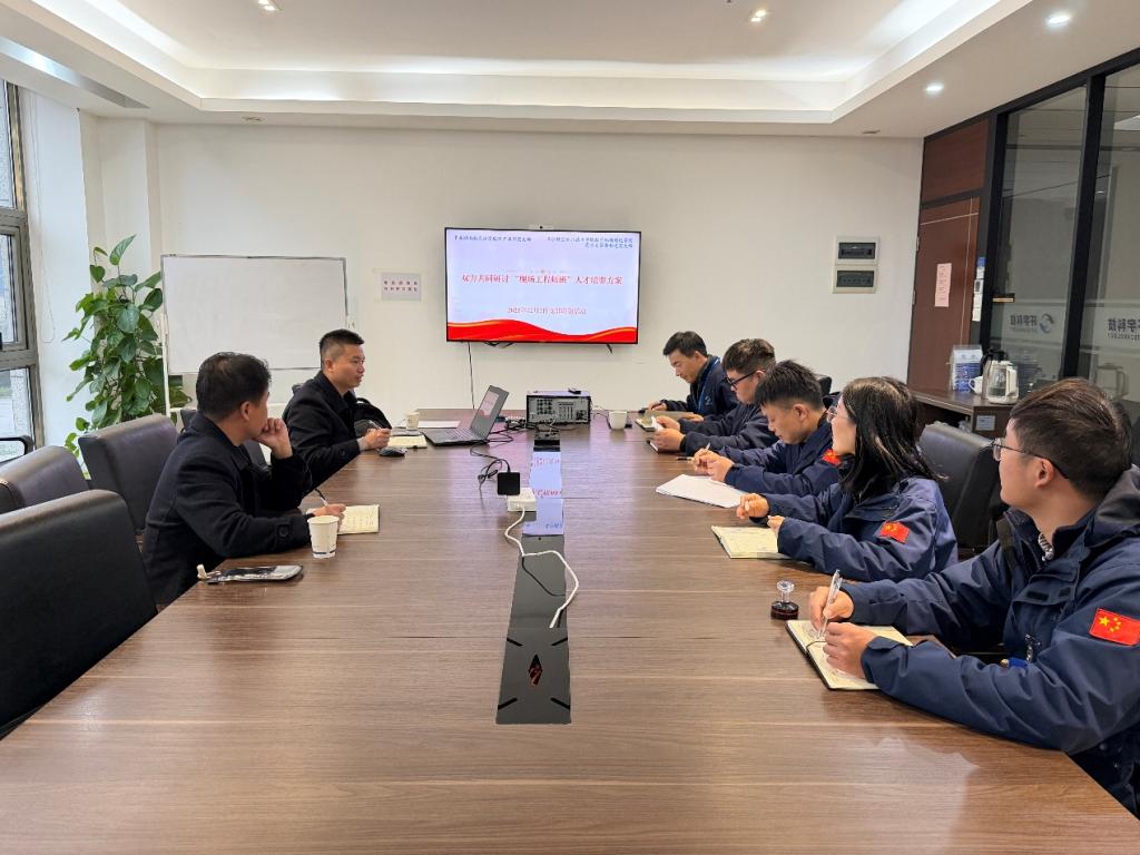 2025年12月2日,我院航空机械制造学院副院长宋福林与装备制造党支部书记、数控技术教研室主任张加锋一行赴湖南航天环宇通信科技股份有限公司(以下简称“航天环宇”),与联建支部航天环宇航空产业园党支部技术骨干,就“航天环宇现场工程师班”人才培养方案开展专题研讨,研讨聚焦 “党建引领、人才共育、资源共享” 的主线展开深入交流。