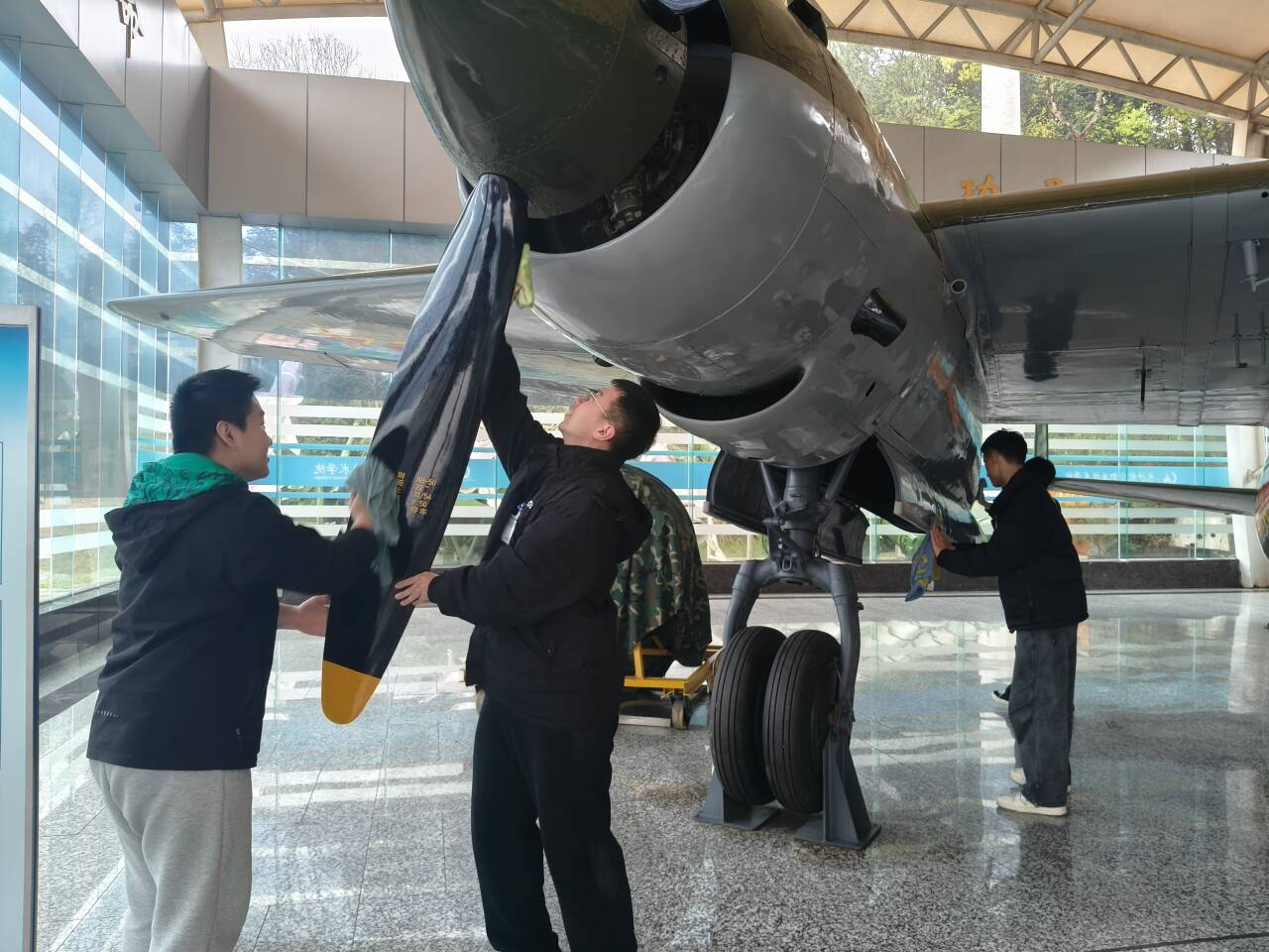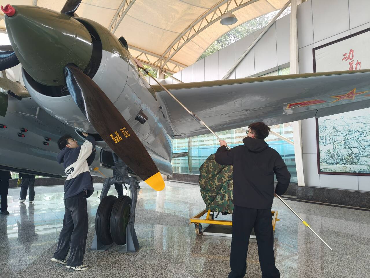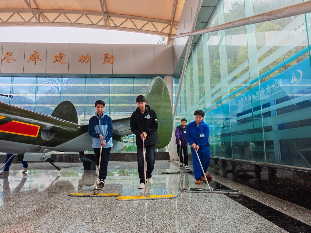 馆内,志愿者们分组协作,细致地擦拭着每一架战机的机身,并清洁展柜与地面。清洁工作不仅是简单的劳动,更成为了一堂深刻的历史教育课。面对那架曾立下赫赫战功的杜-2轰炸机,同学们格外专注。辅导员王菲菲老师结合展陈内容,现场讲述着这架功勋战机的辉煌战史,志愿者们在擦拭机身时,动作也随之变得格外轻柔而庄重。抹布拂过冰冷的金属机身,仿佛正在进行一场穿越时空的对话——与那段热血澎湃的峥嵘岁月相遇,与航空先辈们的奋斗精神共鸣。