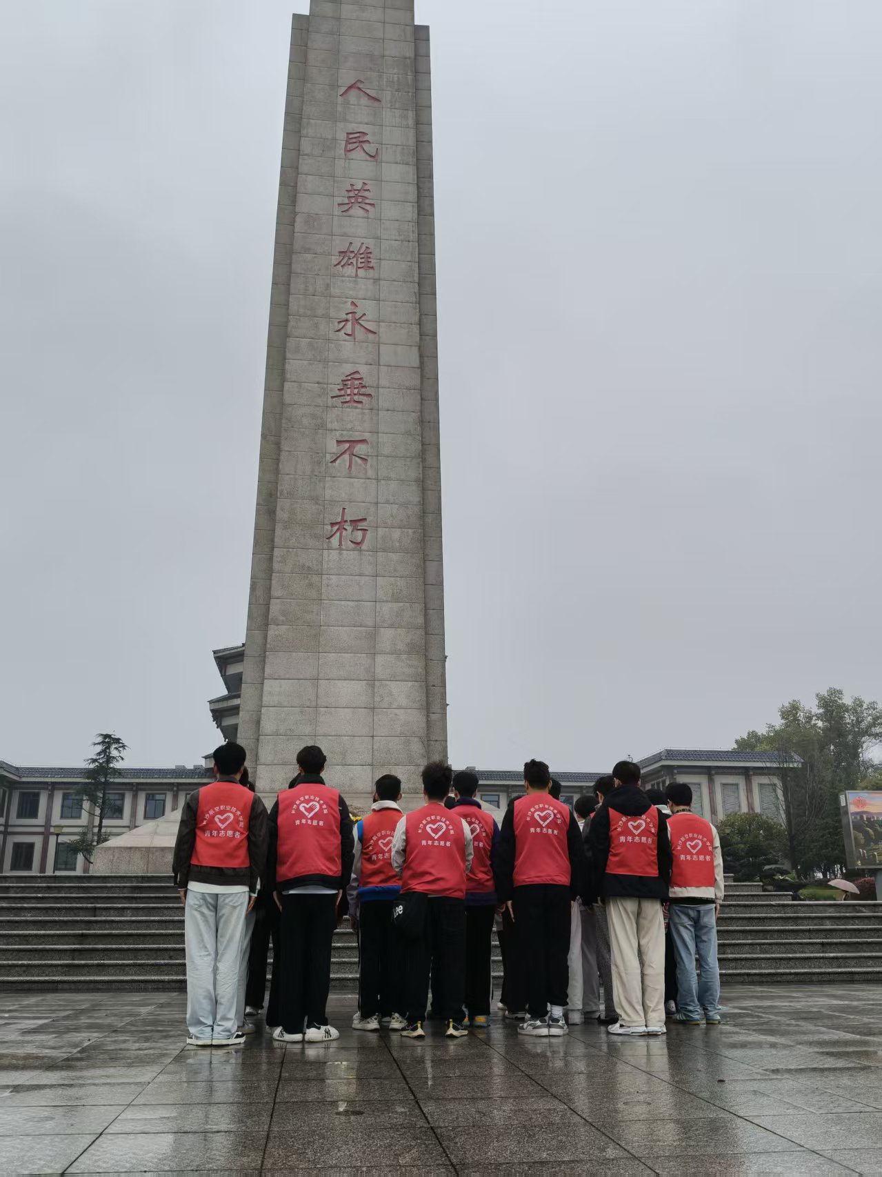 活动结束飞制2501班学生在纪念碑前留影